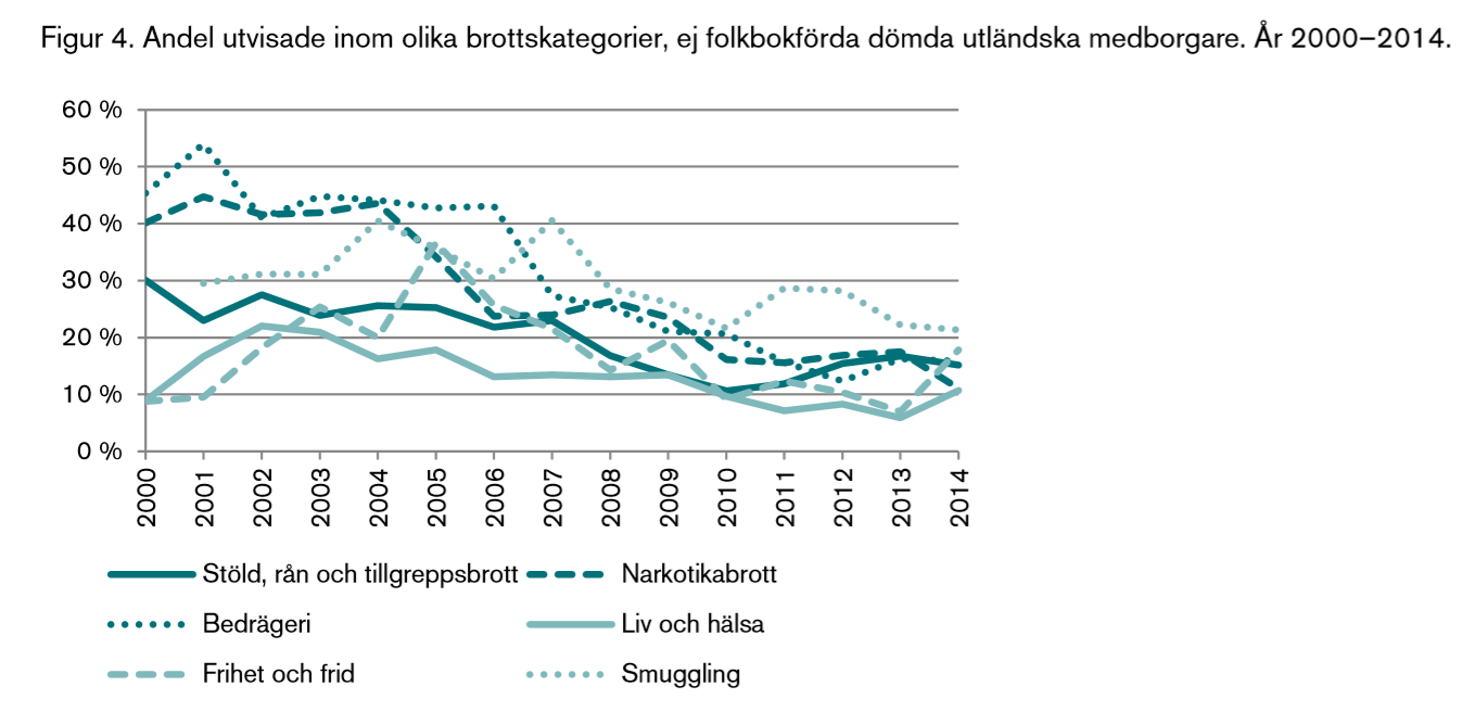 BRÅ har analyserat utvisningarna under åren 2000–2014. Under denna period sjönk andelen utvisade utländska medborgare som dömts för samtliga typer av brott i tingsrätt (med eller utan fängelse i straffskalan) och som inte var folkbokförda i Sverige, från drygt 20 procent till omkring 11 procent. (BRÅ uppger att de inte har denna statistik för åren efter år 2014.)