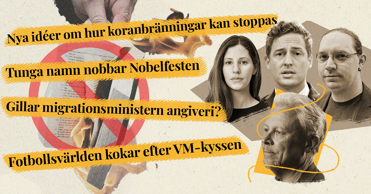Ännu en vecka i koranbränningarnas tecken, med hårda ordväxlingar om huruvida aktionerna är religionskritik eller ska etiketteras som hat och hets. Utrikesminister Tobias Billström anser att en lagändring är nödvändig när ”rikets säkerhet är satt ur spel”. Migrationsministern talar om skärpta regler för återvändande. Nobelstiftelsen bjuder in både Jimmie Åkesson och Rysslands ambassadör i Sverige, vilket verkar leda till serieavhopp från Nobelfesten. Och hur mycket betyder en ovälkommen VM-kyss? Plus förstås Veckans person eller ord.