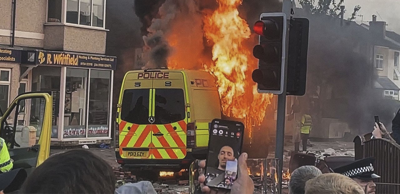 En polisbuss brinner under kravallerna den 30 juli 2024 i Southport, Storbritannien. Foto: Privat