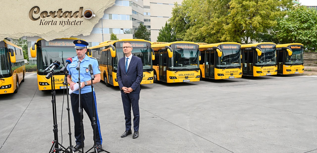 Ungerns vice inrikesminister Bence Rétvári, till höger, och landets biträdande polischef Janos Kuczik håller en gemensam presskonferens på busstationen i Népliget, Budapest, Ungern, fredagen den 6 september 2024. I bakgrunden en rad passagerarbussar med upplysta ”Röszke-Bryssel”-skyltar – en väg som skulle ta migranter från Ungerns södra gräns mot Serbien till EU:s högkvarter i Belgien. Foto: Tibor Illyes/MTI/AP/TT