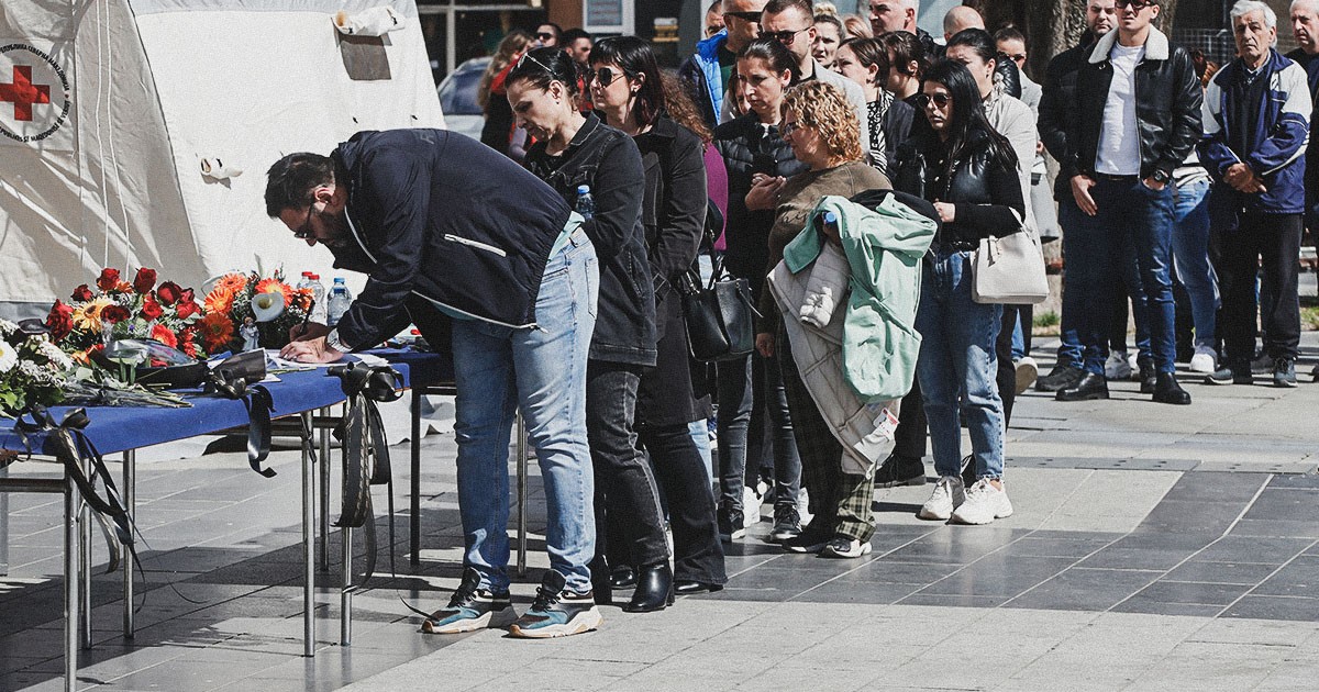 Människor står i kö för att ge kondoleanser till offren för en massiv nattklubbsbrand i staden Kocani, Nordmakedonien, den 17 mars 2025. Foto: Boris Grdanoski/AP/TT