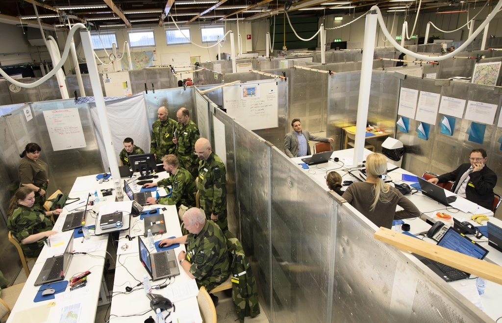 Militär och civila jobbar under övningen Viking 14 vid Ledningsregementet i Enköping. Christian Uhr skriver att dagens pandemi har visat på brister i det svenska krishanteringssystemet. Han menar bland annat att vi måste öva mer och annorlunda. Foto: Fredrik Sandberg / TT