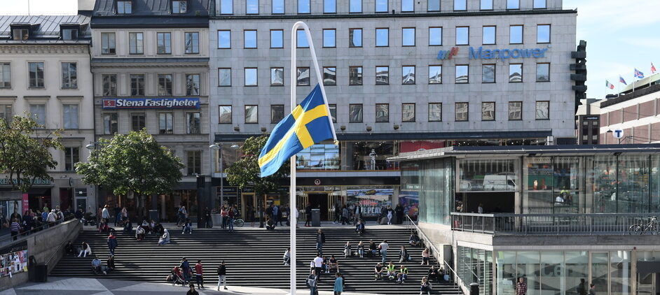 Mattias Norströms omtalade konstverk "Du gamla, du fria" på Sergels torg augusti 2017. Konstverket föreställer en slokande flaggstång med den svenska flagga hängande upp och ner. Foto: Henrik Montgomery /TT