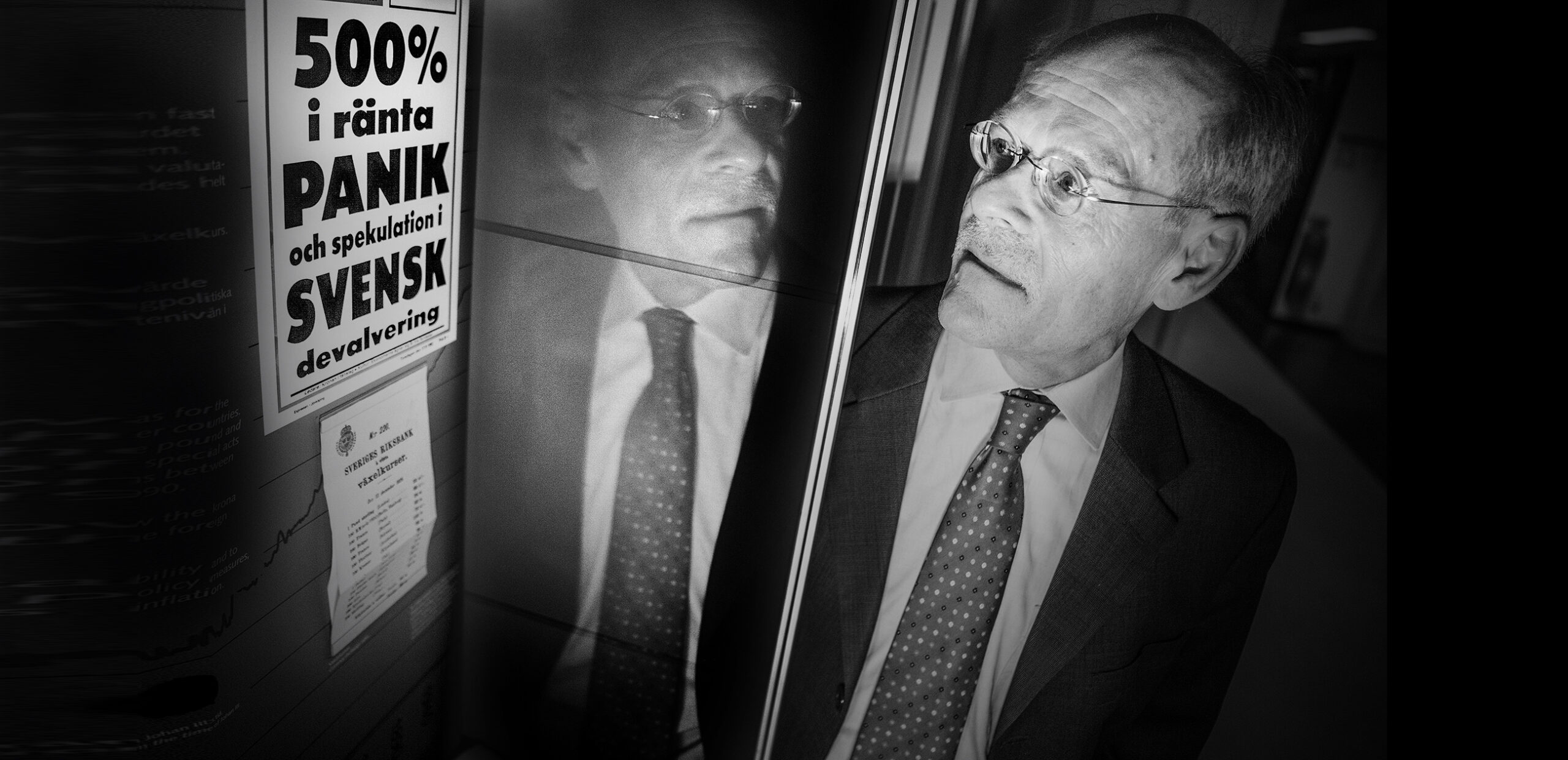 Riksbankschef Stefan Ingves i en korridor i Riksbanken. På väggen sitter en löpsedel från Dagens Nyheter som meddelar att Riksbanken 1992 höjde räntan till 500 procent för att försvara kronan. Foto: Tomas Oneborg / TT.