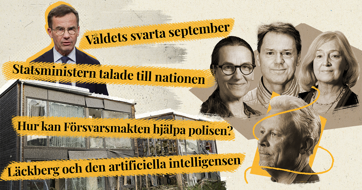 De senaste veckornas skjut- och sprängspiral chockar och skrämmer. Magdalena Andersson förespråkar att polisen ska ta hjälp av militären i kampen mot gängvåldet, och statsministern talade till nationen och kallade till sig rikspolischefen och ÖB. Kungen visade sin medkänsla efter raset vid Stenungsund, det första koranbränningsåtalet är uppe i rätten och Camilla Läckberg är helt oförstående till Kvartals AI-granskning av hennes böcker.
