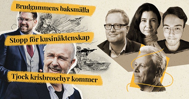 Veckopanelen med Stefan Stern, Vesna Prekopic och Maurits Rannevid under ledning av Staffan Dopping. Det var kanske inte så lämpligt att på sitt bröllop ha en president för en kriminell organisation. Blir det politisk baksmälla nu? Kusinäktenskap är på väg att förbjudas. 7 oktober högtidlighölls på olika sätt: sång och bön bland judar i Stockholm, antisemitiska budskap på demonstration i Malmö. LO:s ordförande flaggar för att ändra de ekonomiska bidragen till Socialdemokraterna, och Carl-Oskar Bohlin frågar vad DU kan göra för staten.
