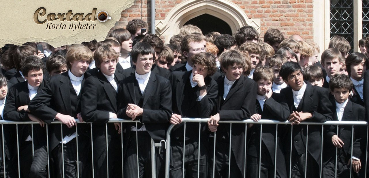 Iförda sin traditionella skoluniform samlas eleverna bakom ett skyddsräcke för att titta på Storbritanniens drottning Elizabeth II och prins Philip under ett besök på Eton College i Windsor, torsdagen den 17 maj 2010. Foto: David Parker/AP/TT
