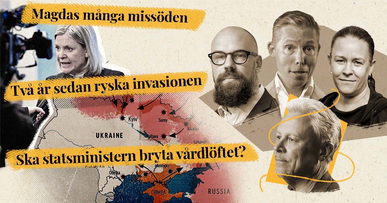 Veckopanelen med Daniel Suhonen, Henrik Jönsson och Maria Wetterstrand under ledning av Staffan Dopping. Magdalena Andersson har haft det hett om öronen, men är de senaste turbulenserna lite allvarligare än tidigare blåsväder? I vilken mån får Socialdemokraterna gehör för sitt fokus på det de kallar vårdkrisen? Det är två år sedan Ryssland angrep Ukraina, och nu aviserar Sverige det största militära stödpaketet hittills. Sverige är fortsatt i ett allvarligt säkerhetsläge.