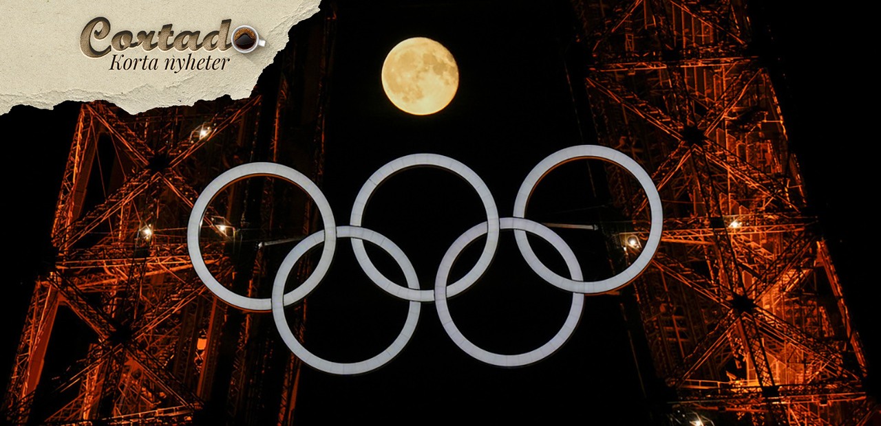 En fullmåne går upp bakom de olympiska ringarna som hänger från Eiffeltornet, måndagen den 22 juli 2024 i Paris, Frankrike. Foto: David J. Phillip/AP/TT