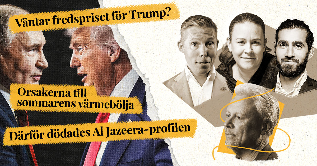 Veckopanelen med Henrik Jönsson, Maria Wetterstrand och Payam Moula under ledning av Staffan Dopping. Donald Trump lovade inför toppmötet att Vladimir Putin inte kan köra med honom. När kan Europa andas ut? Sommarens svenska värmebölja blir mindre ovanlig i framtiden. Efter Israels attack mot Al Jazeera-profilen – kan man vara terrorist och journalist på samma gång? De äldres tandvård ska bli billigare, och nu vet vi lite om ett av dokumenten som förre säkerhetsrådgivaren glömde kvar.