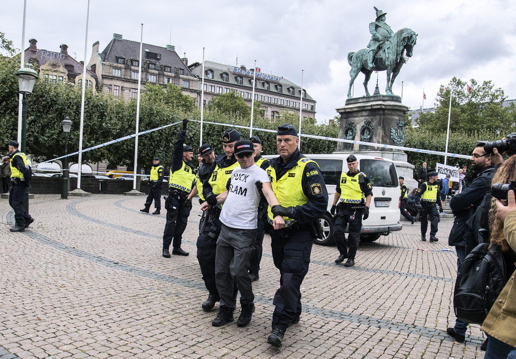 Polis griper danska demonstranter som sparkat på koranen på Stortorget i Malmö. Johan Nilsson/TT