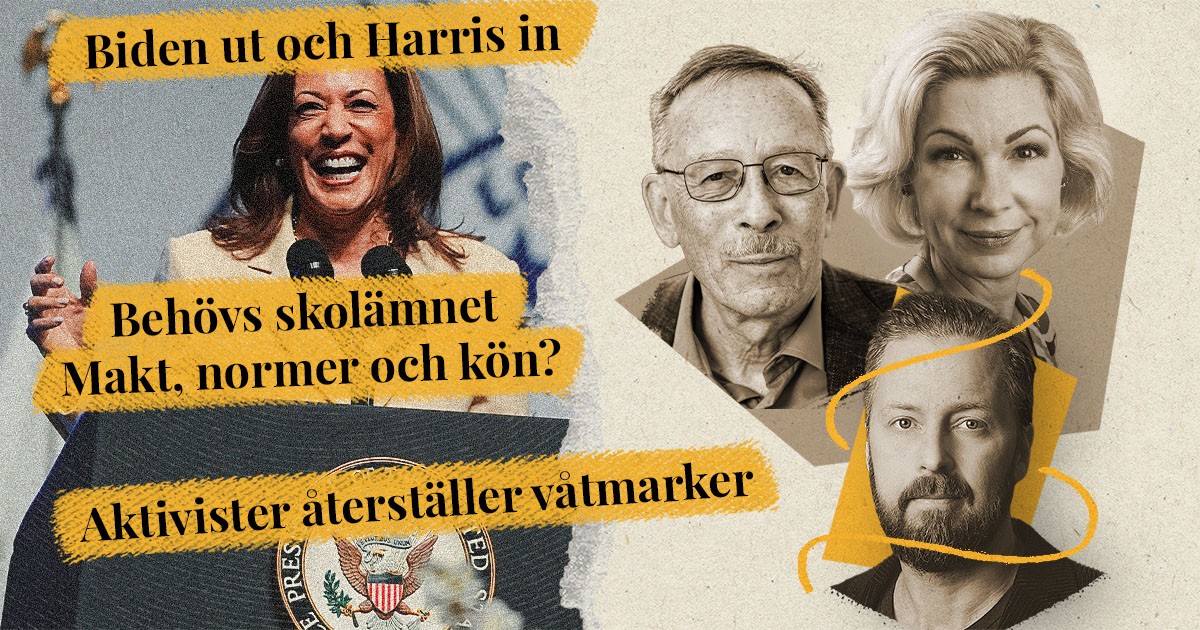 Veckopanelen med Lars Calmfors och Anna-Karin Wyndhamn under ledning av Magnus Thorén. Södertälje åter i fokus när det gäller gängkrig och oskyldiga som drabbas. Aktivisterna i Återställ våtmarker gör precis som de heter och dämmer olovligen upp en torvtäkt i Tranemo. Makt, normer och kön blir nytt tillvalsämne i gymnasiet i höst, och efter veckor av ökat tryck kliver Joe Biden ut och Kamala Harris in i matchen om presidentposten. Vad betyder det för oss i Europa och Sverige?