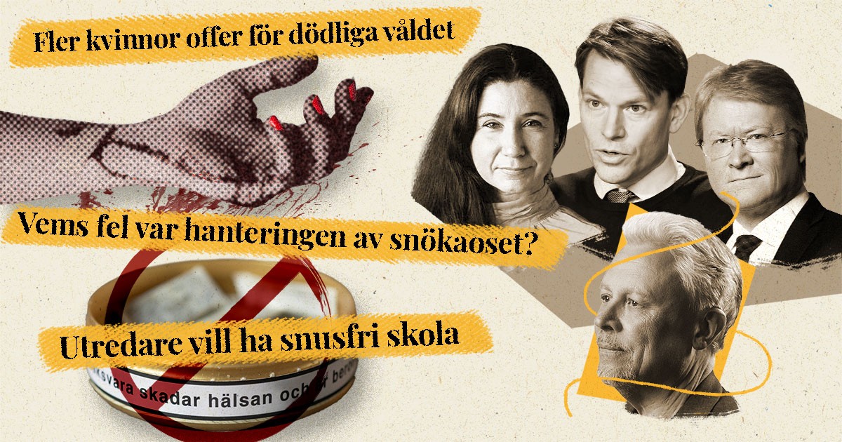 Veckopanelen med Vesna Prekopic, PM Nilsson och Lars Adaktusson under ledning av Staffan Dopping. Fler kvinnor blev under 2023 offer för det dödliga våldet, visar Brås rapport. Trafikverket förstod inte sin ledarroll under snökaoset i Skåne. Apotek och tillverkare inför åldersgränser för inköp av hudvårdsprodukter. En statlig utredare vill ha snusförbud för skolelever. Kritiserade biståndsorganisationen Islamic Relief har köpt reklamplats på bussar och tåg, och förre generaldirektören Mikael Ribbenvik Cassar har skrivit en bok om vad som hände under flyktingkrisen.