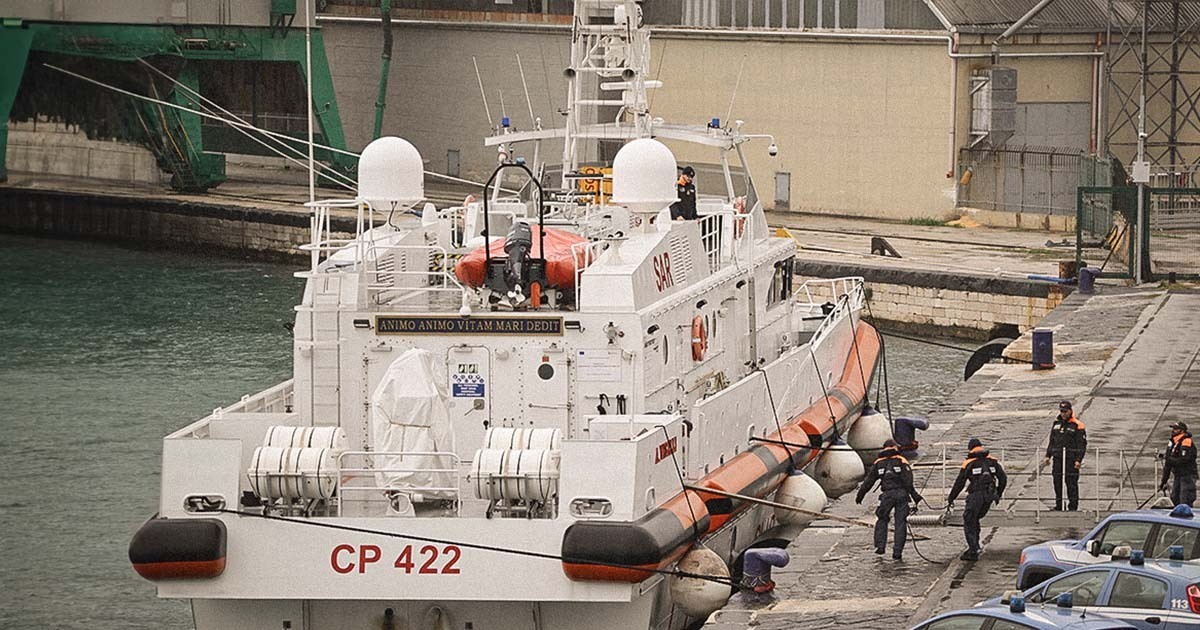 Ett italienskt kustbevakningsfartyg tar tillbaka migranter från ett nyöppnat asylcenter i Shengjin, Albanien, till hamnen i Bari, Italien, lördagen den 19 oktober 2024. Foto: Valeria Ferraro/AP/TT