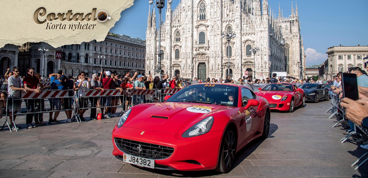 Ferraribilar paraderar framför Milanos katedral, med anledning av det historiska Mille Miglia-loppet, i Milano, Italien, fredagen den 16 juni 2023. Foto: Claudio Furlan/LaPresse/AP/TT