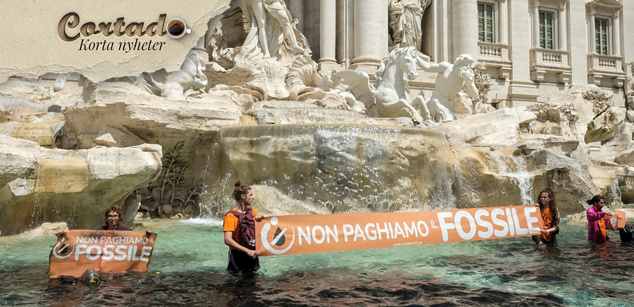 Sista generationen-aktivister visar en banderoll mot användningen av fossila bränslen när de arrangerar en demonstration i Fontana di Trevi i Rom, söndagen den 21 maj 2023. Foto: Mauro Scrobogna/LaPresse