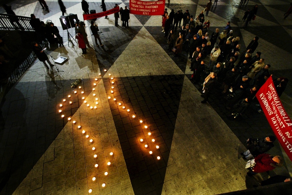 Ljusmanifestation för den mördade Fadime Sahindal. Texten handlar om ett annat fall av hedersvåld. Foto: Benkt Eurenius/TT