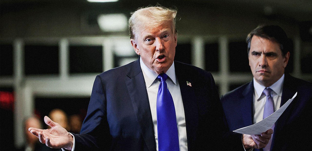 Republikanernas presidentkandidat Donald Trump talar med media inför domstolsförhandlingar i New York, torsdagen den 30 maj 2024. Foto: Justin Lane/AP/TT