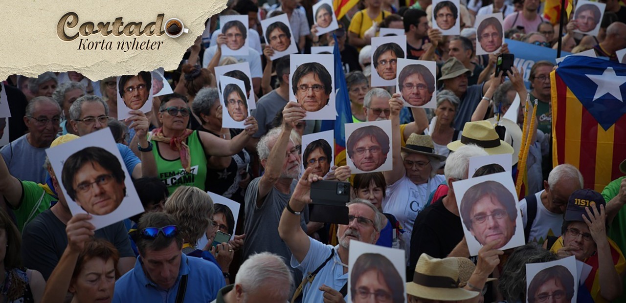 Anhängare av den katalanska självständighetsledaren Carles Puigdemont håller hans porträtt medan de väntar på hans ankomst nära det katalanska parlamentet i Barcelona, Spanien, torsdagen den 8 augusti 2024. Foto: Emilio Morenatti/AP/TT