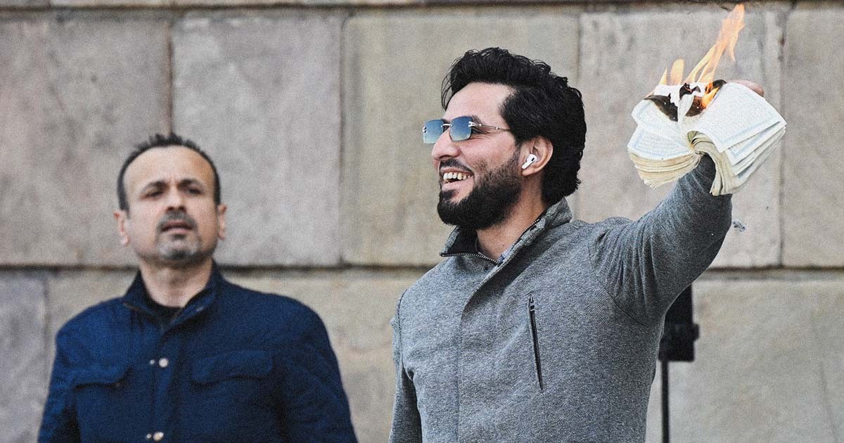 Salwan Momika bränner en koran under en demonstration. Salwan Najem i bakgrunden. Foto: Anders Wiklund/TT