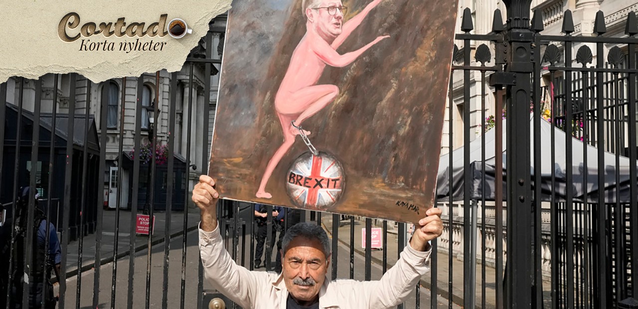 Konstnären Kaya Mar håller upp en karikatyr vid porten innan Storbritanniens premiärminister Keir Starmer lämnar 10 Downing Street för att delta i premiärministersessionen i parlamentet i London, onsdagen den 24 juli 2024. Foto: Frank Augstein/AP/TT