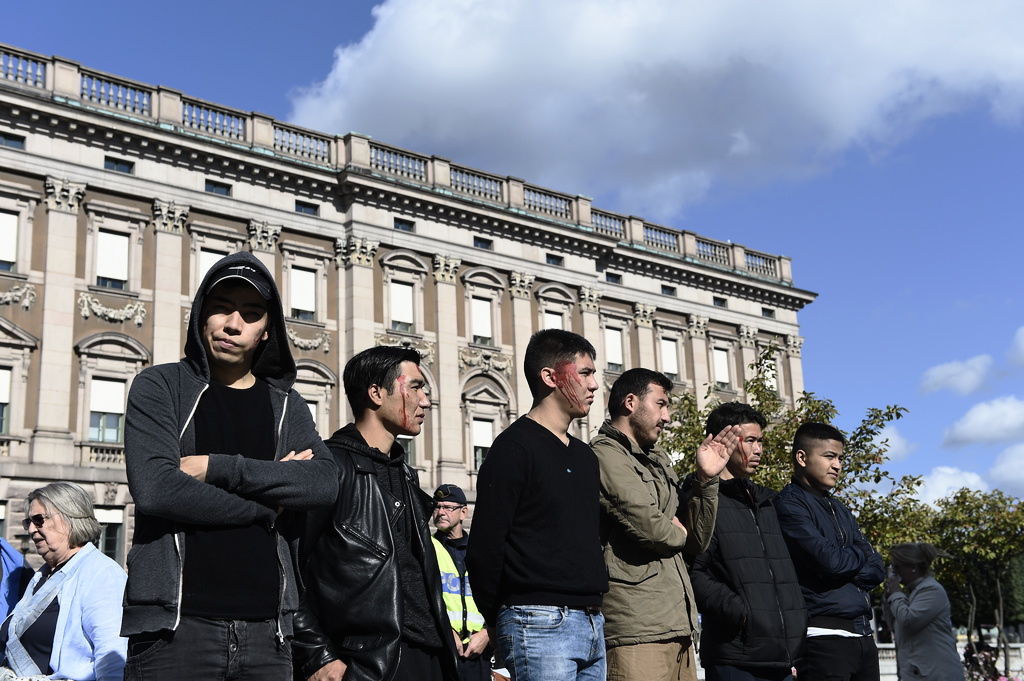 Vad sysslar lagstiftarna med nu då? Män från Afghanistan köar till debatt om ensamkommande i riksdagen 2017. Foto: Alexander Larsson Vierth/TT/