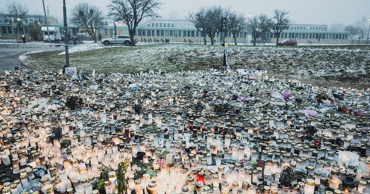 Blommor och ljus vid minnesplatsen utanför skolan efter skolskjutningen på Campus Risbergska där 11 personer miste sina liv. Foto: Christine Olsson/TT