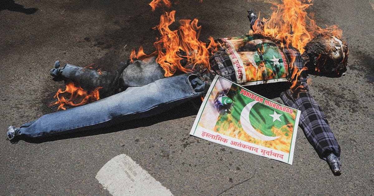 Anhängare av All India Students' Council bränner en docka under en protest mot det blodiga terrordådet nära Pahalgam i det indiskt kontrollerade Kashmir, den 24 april 2025. Affisch på hindi: ”Ned med islamisk terrorism”. Foto: Ajit Solanki/AP/TT
