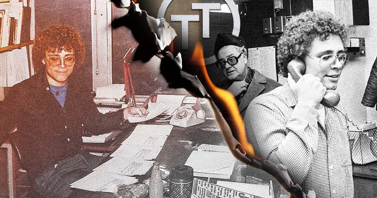 TT:s radioredaktion julen 1979. Nyheterna ska ut om än uppläsaren har sot i barret. Kollage: Ducktape. Foto: privat/okänt