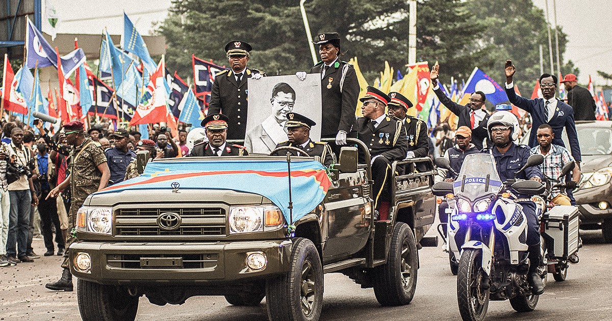 Ett militärfordon transporterar en guldtand som tillhörde Kongos självständighetshjälte Patrice Lumumba till ett minnesmonument i Kinshasa, torsdagen den 30 juni 2022. Foto: Samy Ntumba Shambuy/AP/TT