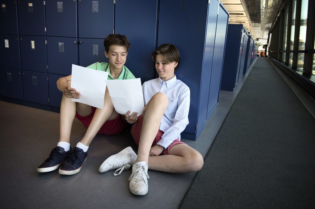 Två grundskoleelever tittar på sina betyg. Foto: Jessica Gow/TT.