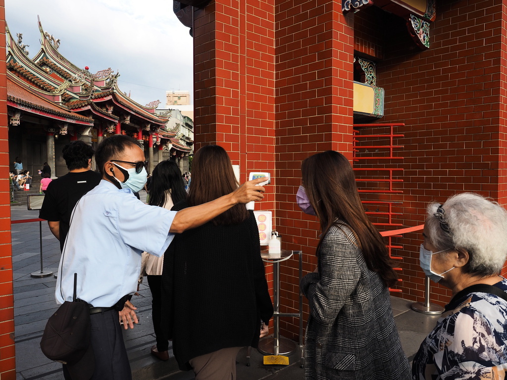 Med en resolut pandemibekämpning har Taiwan lyckats undgå en andra våg och förväntas uppnå positiv BNP-tillväxt i år. Trots att det har gått över 200 dagar sedan någon smittades i landet måste taiwaneserna ha ansiktsmasker på många offentliga platser. Feberscreening är vanligt, som här vid ingången tll Xingtiantemplet i Taipei. Foto: David Chang/TT.