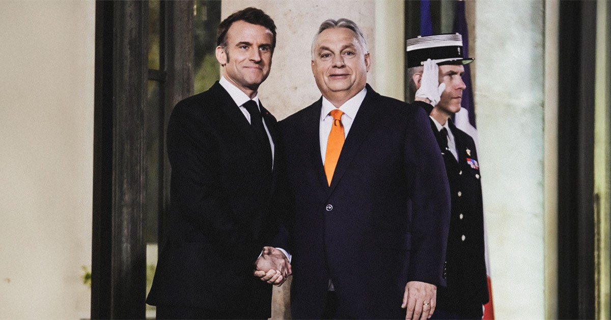 Frankrikes president Emmanuel Macron välkomnar Ungerns premiärminister Viktor Orbán vid Elyseepalatset, Paris, den 5 mars 2025. Foto: Michel Euler/AP/TT