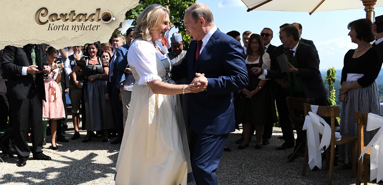 Rysslands president Vladimir Putin dansar med Österrikes utrikesminister Karin Kneissl när han gästar hennes bröllop med den österrikiske affärsmannen Wolfgang Meilinger i Gamlitz, södra Österrike, lördagen den 18 augusti 2018. Foto: Roland Schlager/AP/TT