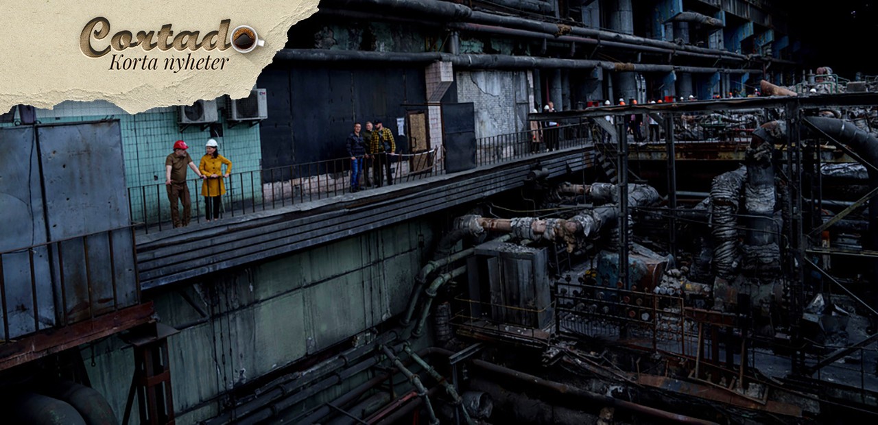 Tysklands utrikesminister Annalena Baerbock talar med Ukrainas energiminister Herman Halusjtjenko under ett officiellt besök i ett värmekraftverk som förstördes av en rysk raketattack i Ukraina tisdagen den 21 maj 2024. Foto: Evgeniy Maloletka/AP/TT