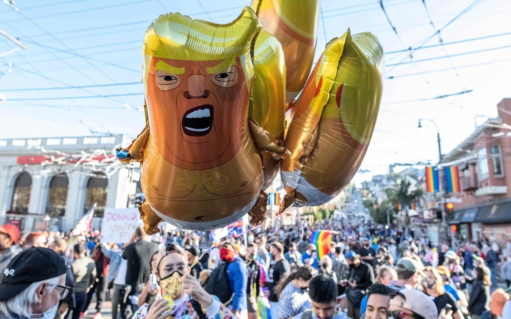En Biden-supporter håller i ballonger föreställande Donald Trump som en arg baby. Hur kommer progressiva amerikaner att hantera Trumps fortsatt dominanta position i USA? Foto: Josh Edelson/TT