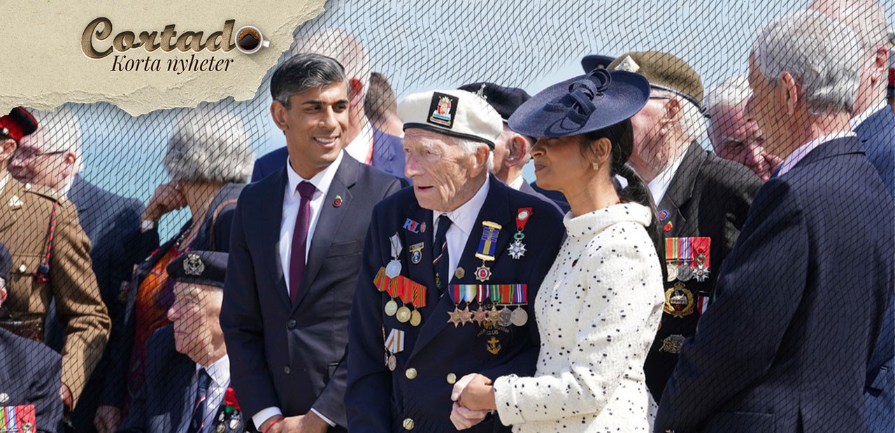 Rishi Sunak och hustrun Akshata Murty med D-dagsveteranen Alec Penstone, 98. vid den brittiska minnesceremonin i Normandie på torsdagen. Sedan åkte Sunak hem igen. Foto: Gareth Fuller/AP/TT