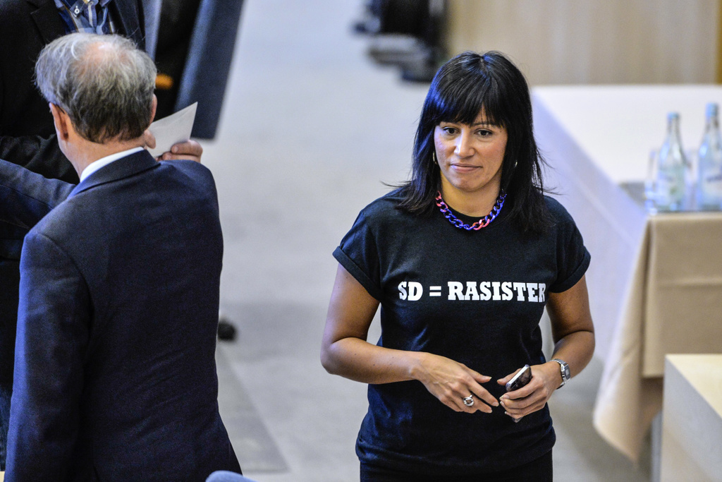 Rossana Dinamarca (V) gör en opsykologisk insats i riksdagen 2014. Foto: Stefan Mattsson / TT