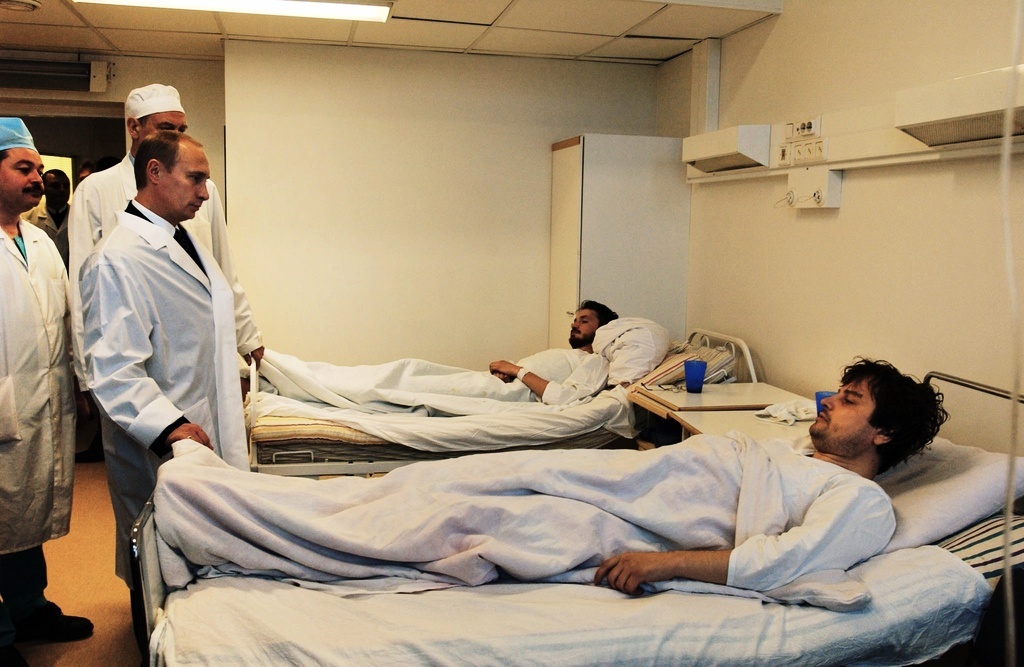 Vladimir Putin besöker överlevande efter terrorattacken mot en teater i Moskva 2002. Foto: ITAR-TASS/TT