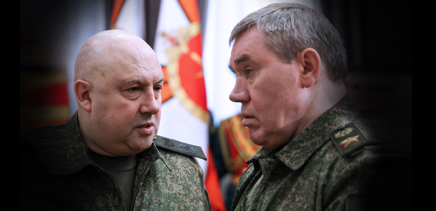 Avgående ryske befälhavaren i Ukraina general Sergej Surovikin till vänster, och tillträdande befälhavare general Valerij Gerasimov, till höger. Foto: Mikhail Klimentyev /TT