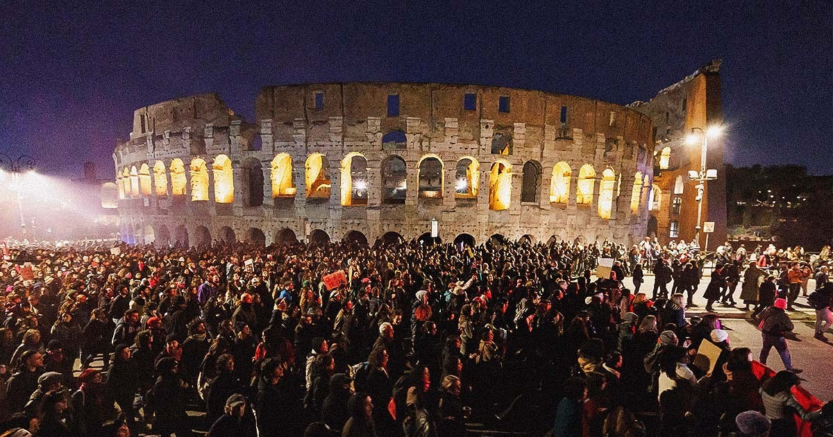 En demonstration mot kvinnovåld utanför Colosseum i Rom, lördagen den 23 november 2024. Foto: Roberto Monaldo/LaPresse via AP/TT