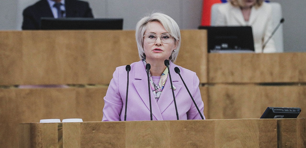 Den ryska lagstiftaren Elvira Aitkulova, en av författarna till förslaget som förbjuder ”barnlöshetspropaganda”, talar i statsduman i Moskva, torsdagen den 17 oktober 2024. Foto: The State Duma/AP/TT