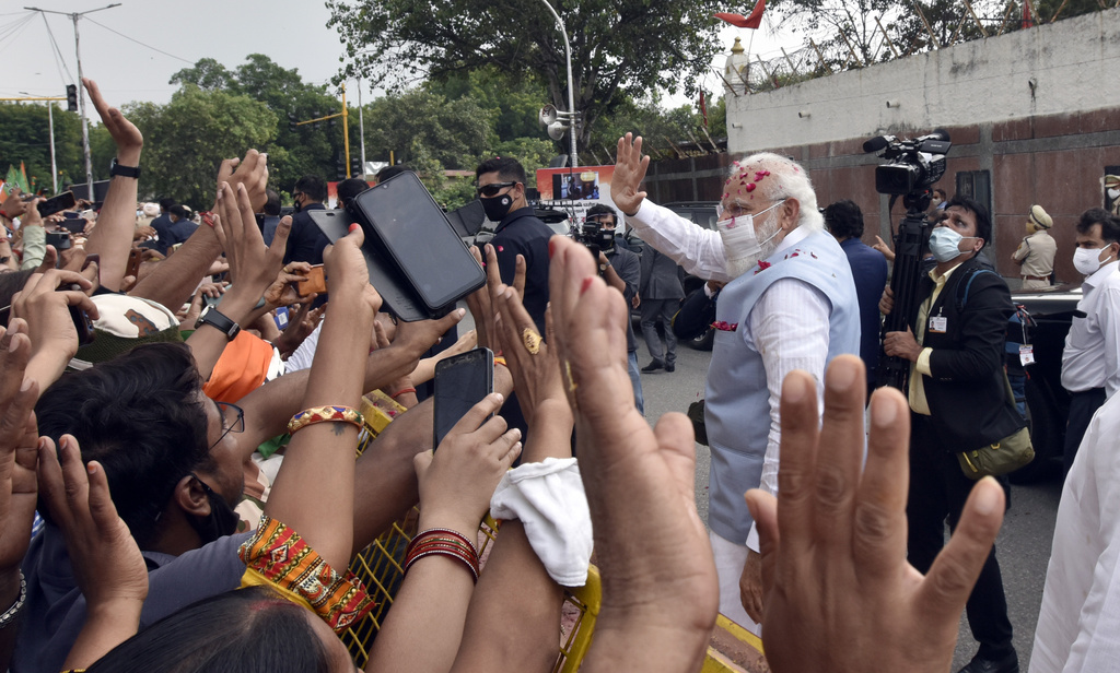 Indien brukar kallas världens största demokrati. Men nu sker förändringen snabbt. På bilden Indiens premiärminister, hindunationalisten Narendra Modi omgiven av sina supportrar. Foto från september 2021. FOTO: Sanjeev Verma/Hindustan Times/Shutterstock /TT