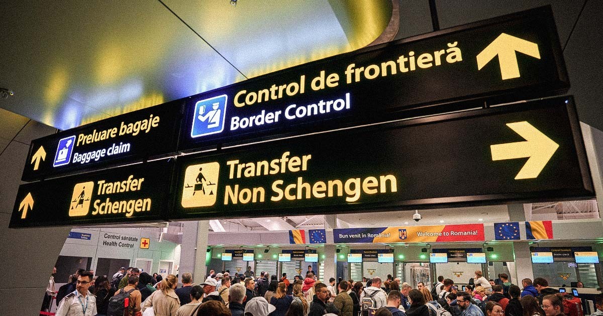 Resenärer passerar en Schengen-skylt på Henri Coanda International Airport nära Bukarest, Rumänien, söndagen den 31 mars 2024. Foto: Andreea Alexandru/AP/TT