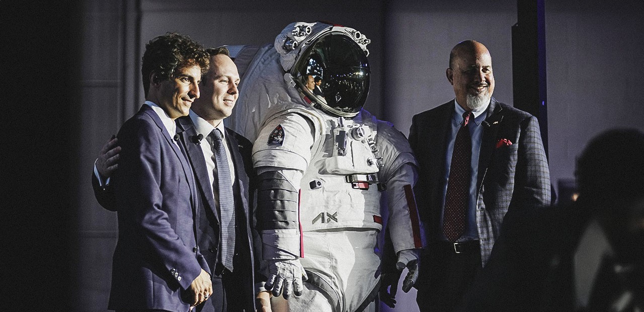 Matt Ondler, chef på Axiom Space, till höger, Lorenzo Bertelli, marknadschef på Prada Group, till vänster, och Russell Ralston, vice vd på Axiom Space, poserar bredvid deras gemensamt formgivna rymddräkt, i Milano, Italien, onsdagen den 16 oktober 2024. Foto: Antonio Calanni/AP/TT