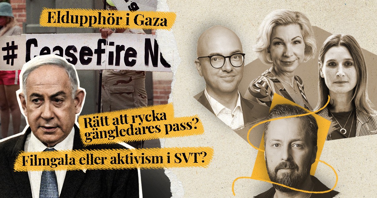 Veckopanelen med Lisa dos Santos, Anna-Karin Wyndhamn och Torbjörn Hållö under ledning av Magnus Thorén. Är vapenvilan i Gaza Donald Trumps förtjänst? Statsminister Ulf Kristersson KU-anmäls av Vänsterpartiet efter att nationella säkerhetsrådgivaren Henrik Landerholm glömt sekretessbelagda handlingar på en kursgård, segrade aktivismen över filmkonsten på Guldbaggegalan i SVT, har bruket av adhd-diagnoser börjat löpa amok inom Barn- och ungdomspsykiatrin och är ökade möjligheter att ta passet från gängledare ett effektivt grepp i kampen mot brottsligheten?