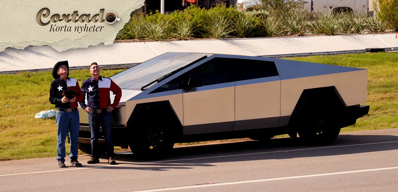 Män med västernskjortor som har Texas flaggtema står bredvid en Tesla Cybertruck på Tesla Gigafactory i Austin, Texas, torsdagen den 13 juni 2024. Foto: Eric Gay/AP/TT