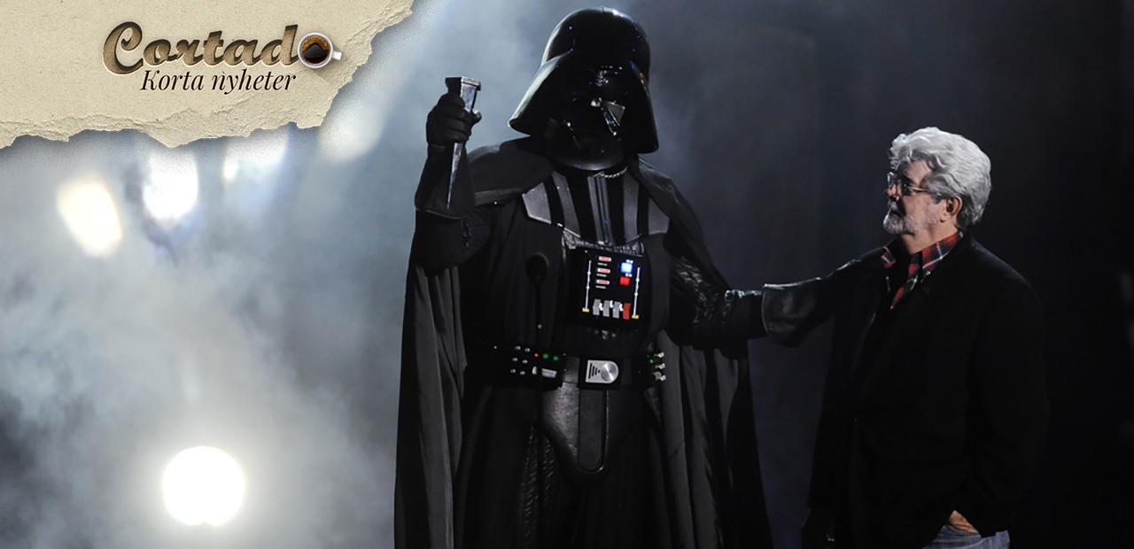 På denna arkivbild från 15 oktober 2011 tar ”Darth Vader” emot priset Ultimate Villain från Star Wars skapare George Lucas under 2011 års Scream Awards i Los Angeles, USA. Foto: Chris Pizzello/AP/TT
