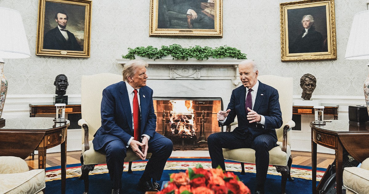 Tillträdande presidenten Donald Trump i möte med avgående presidenten Joe Biden, Ovala rummet, Washington, den 13 november 2024. Foto: Evan Vucci/AP/TT