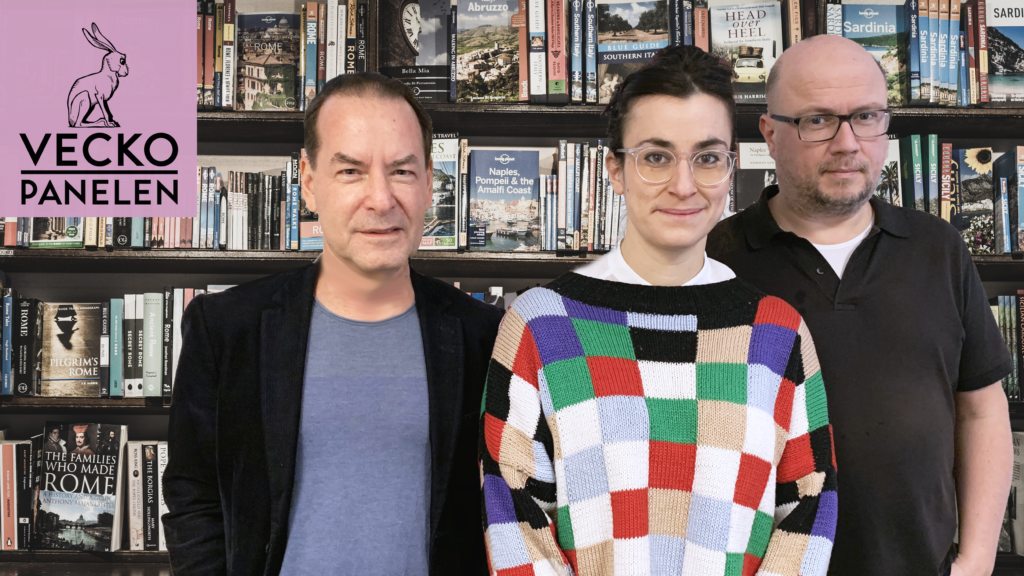 Veckopanelen med Stefan Krakowski, överläkare och skribent,  Sabina Edelman, civilingenjör och miljöpartist och Torbjörn Elensky, författare om friande förtalsdomen mot Soffan, SAS-reklamfilmen mm.